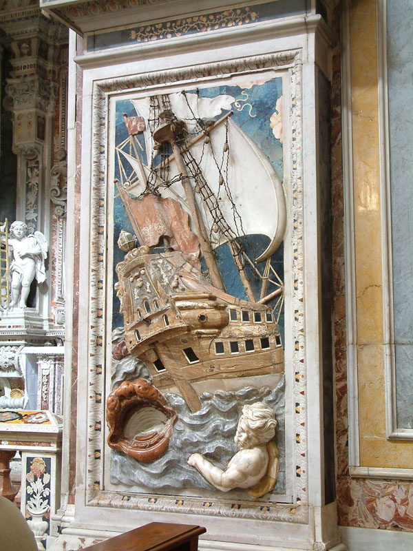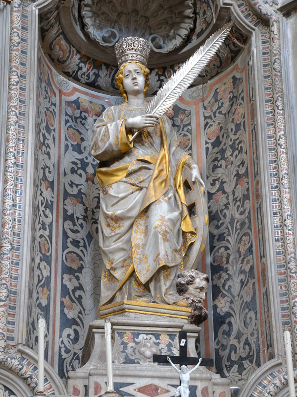 Le cappelle contengono una significativa antologia di pitture seicentesche delle quali si ignorano gli autori. Nell’ala destra del transetto, si trova l’altare dedicato a S. Caterina d’Alessandria, magnifico impianto scenico eseguito su disegno dell’arch. Andrea Palma; la statua della Santa, opera di Antonello Gagini del 1534, è circondata da statue allegoriche. La pavimentazione in marmo presenta in prossimità dell’altare, un medaglione che raffigura il cane con la fiaccola, simbolo dell’Ordine Domenicano.