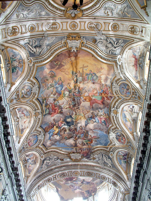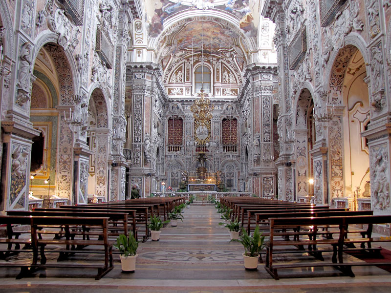 L’interno della chiesa fu arricchito nel corso dei secoli XVII e XVIII, da un magnifico manto parietale in marmi mischi e tra mischi. La decorazione avvenne in tempi diversi, come le interruzioni in alcuni punti ben testimoniano; la prima fase interessò il rivestimento dei pilastri della cupola, completata da quattro statue raffiguranti i Santi Domenicani, posti simbolicamente a sorreggerne l’impianto. Sculture, affreschi e stucchi pregevoli rivestirono le pareti della chiesa ed ornarono le cappelle; in particolare notevoli risultano i preziosi riquadri in marmi mischi e i bassorilievi posti alla base delle lesene lungo la navata ed i medaglioni con le vicende di S. Caterina sulle pareti del presbiterio. Fra tutti gli altorilievi il famoso episodio di Giona del vecchio testamento si stacca nettamente dagli altri per inventiva e finezza di esecuzione. A testimonianza delle esose donazioni liberali, si ritrovano apposti su alcuni pilastri adiacenti le cappelle gli stemmi nobiliari dei casati delle badesse. Molte anche le preziosità artigianali custodite nella chiesa, tra cui segnaliamo degli angeli laminati in argento sull’altare principale, le griglie in argento a canestro fitto dei confessionali, il grande torciere secentesco sospeso sotto la cupola.