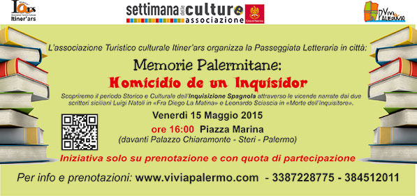 Sulla scorta di alcuni testi letterari, che introdurranno e affronteranno il tema trattato, si rivisiterà mediante gli "occhi" di alcuni scrittori, il periodo storico e culturale dell'Inquisizione spagnola presente a Palermo dal XV sec. in poi. La finalità della passeggiata sarà quella di rievocare, attraverso la lettura di stralci di brani tratti da due opere letterarie scelte, la visione di una Palermo cinque-seicentesca con le tutte le peculiarità del tempo, approfondendone le condizioni politiche, sociali e storiche. I testi di riferimento saranno essenzialmente due, quello più romanzato e fantasioso di Luigi Natoli (William Galt) dedicato alla vicenda di "Fra Diego La Matina", uno dei più interessanti personaggi della storia dell'inquisizione siciliana, e il testo di Leonardo Sciascia "Morte dell'Inquisitore" anch'esso dedicato alla vicenda del frate di Recalmuto ma più fedele alla verità storica e documentata sul caso riguardante il religioso.